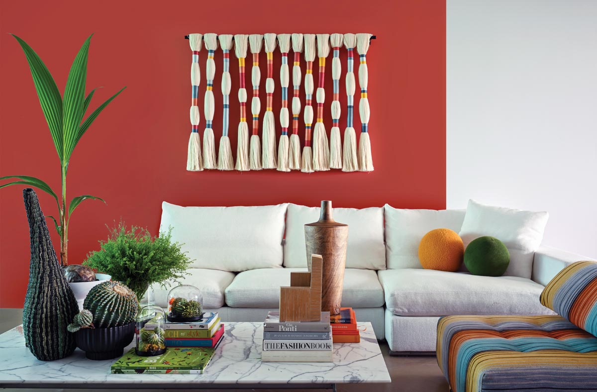 They did, indeed. An accent wall in rich purple welcomes guests to the apartment. A vibrant terracotta sets the ideal backdrop for a Mexican textile sculpture in the family room. Hunter green provides the ideal counterpart to black cabinetry in the kitchen. And a euphoric, bright red saturates Gomez-Ortigoza’s studio.