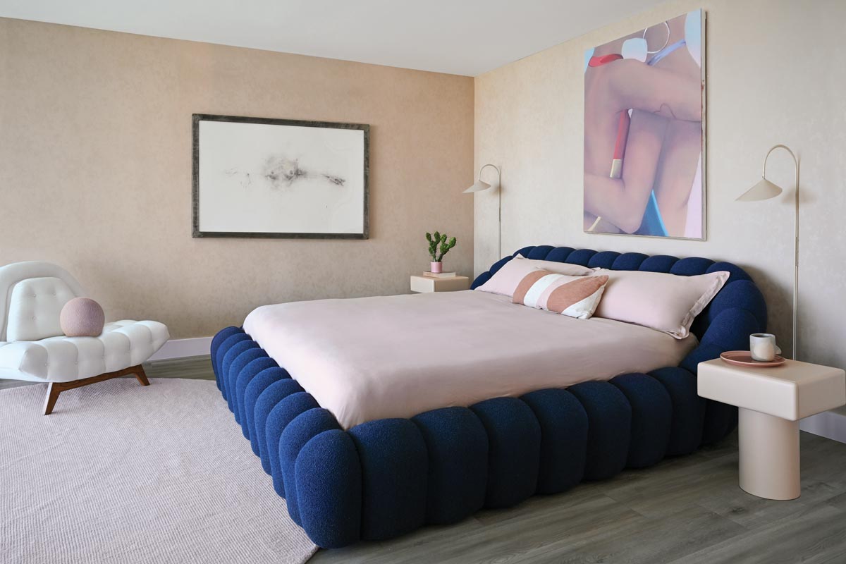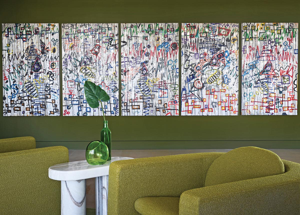 Throughout the home, compelling original artworks and photography merge with sculptural furnishings and meaningful collections—all interwoven and unified by color and self-reflective of the couple’s personal journeys.