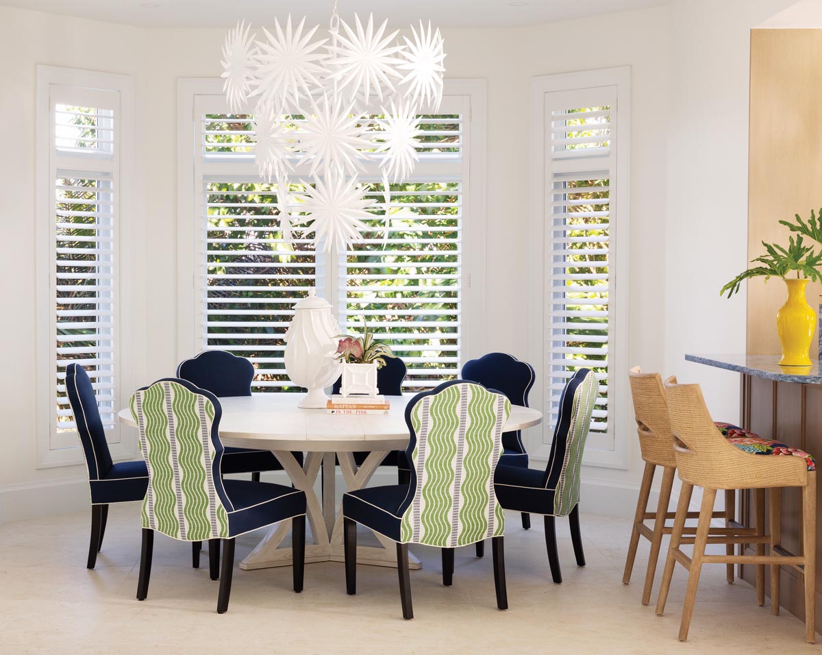 For the kitchen, the homeowner came to Fogarty with photos and ideas, and the designer helped her figure out the layout changes and materials to achieve that vision. “We did all new windows above the sink,” she says. “And we made the island longer with a dropdown table at the end for dining.” Early on, the duo found a Schumacher fabric with whimsically embroidered sea creatures and decided it would be perfect for the valances. Picking up on the blue in the fabric, Fogarty choose navy for the blue lacquered counter stools and a beaded chandelier.
