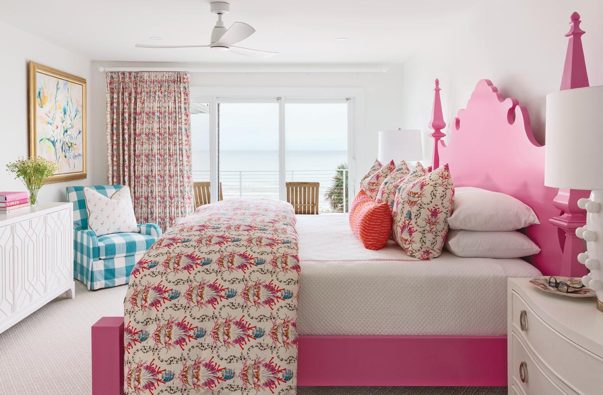 As Fogarty and the wife talked through the decor, the designer suggested new schemes to update the guest bedrooms. “The family has always known these as the coral room, the purple room, and the pink room due to the color of their walls,” says Fogarty. “We decided to keep the names, but not drench the rooms in those colors as they’d once been. Instead, we chose colorful headboards and repeated the color in the fabric.”