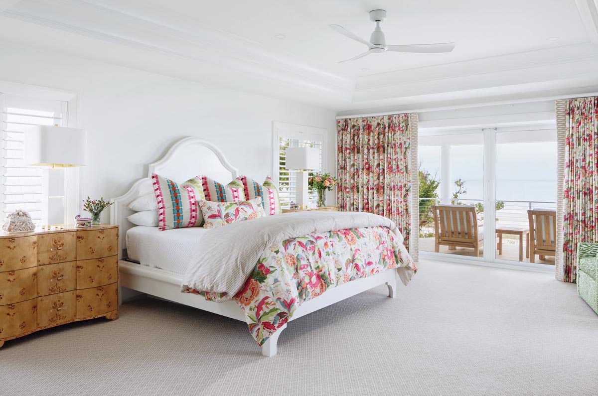 For the primary bedroom, which wasn’t pre-designated with a color theme, Fogarty and the wife again found a fabric they loved—this time by Brunschwig & Fils—and liberally used it for both the headboard and drapes. “We still needed a few fabrics, so we went to the International Design Source in Naples,” says Fogarty. “We found that main fabric, plus the animal print for the chair and the fabric we still needed for the pink bedroom.”