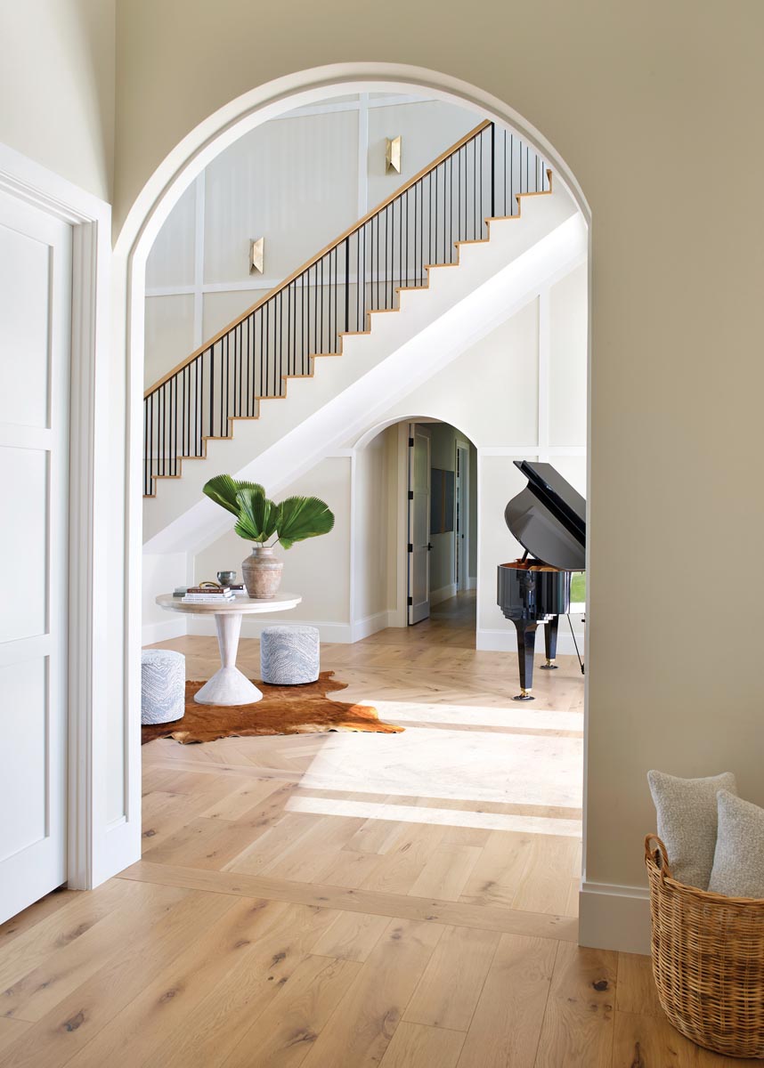The home’s architectural style blends elements of tropical modern design with classic detailing, such as the double-storied entrance and a roofline embellished with gleaming rafter tails that add refined elegance to the white facade. The wood flooring used throughout—engineered European white oak—was a pivotal design choice selected for its warmth and character. In the grand entry, a custom herringbone floor inlay creates a stunning focal point, setting a tailor-made tone for the rest of the residence. Bespoke furnishings reflect the clients’ casual lifestyle, while also prioritizing durability and performance.