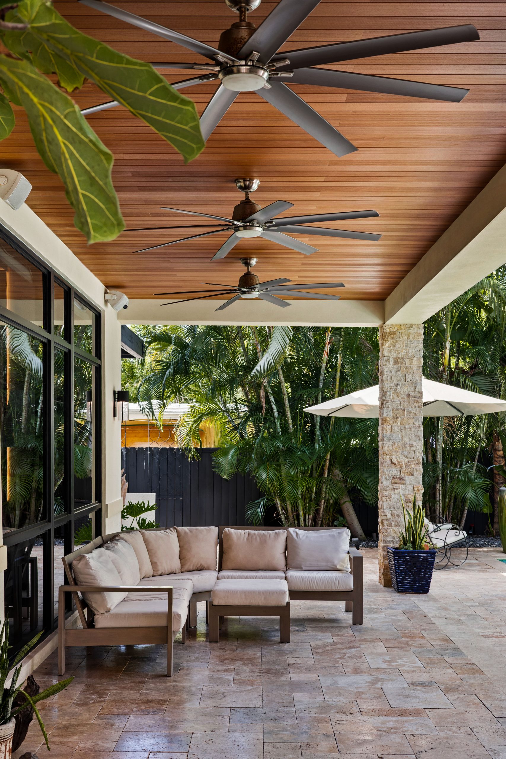 The project features planks in Maximo Thermowood Ayous 1×6 prefinished in SAICOS color TEAK, a wood species that goes through a thermal modification process. It spans the ceiling over a spacious outdoor lounge and dining area, with a pool just beyond the covered space. Oversized ceiling fans from the original build provide airflow and shade to beat Miami’s heat, while natural stone columns and lush landscaping complete the setting. The warmth of the wood ceiling elevates the space and adds visual texture to what might otherwise be a blank area.